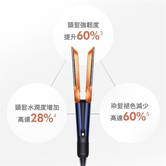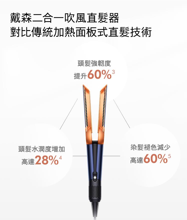 3. 乾濕兩用省時省心:不依賴加熱面板,無熱傷害: 傳統加熱式直髮器,利用高溫造型易造成頭髮斷裂乾枯。Dyson二合一吹風直髮器,提升髮絲強韌度60% / 水潤度28%/ 染髮退色60%