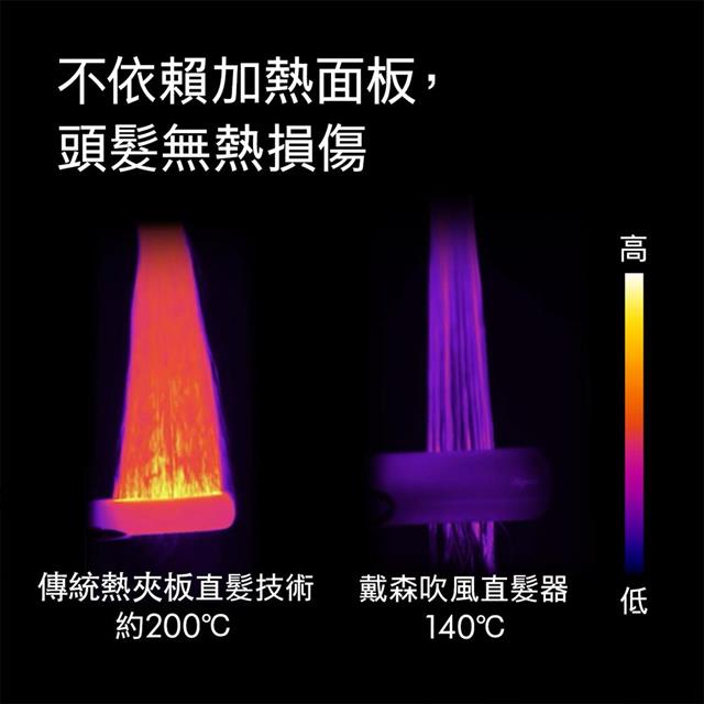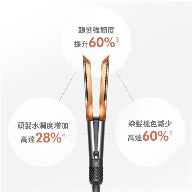 3. 乾濕兩用省時省心:不依賴加熱面板,無熱傷害: 傳統加熱式直髮器,利用高溫造型易造成頭髮斷裂乾枯。Dyson二合一吹風直髮器,提升髮絲強韌度60% / 水潤度28%/ 染髮退色60%