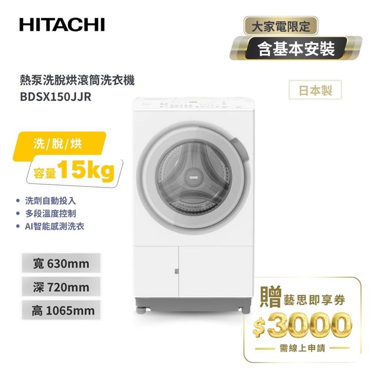 【HITACHI 日立】15(KG) 日本原裝 IOT智能自動投洗滾筒式洗衣機洗脫烘 BDSX150JJR 右開 雪霧白