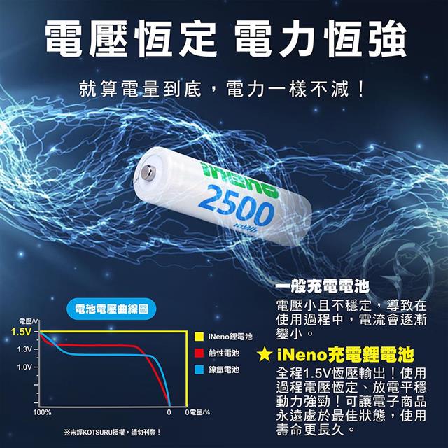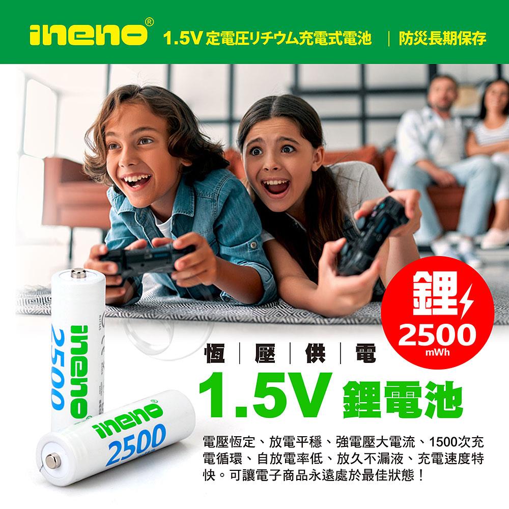 iNeno3號充電電池 /AA 恆壓可充式 1.5V鋰電池 全新特大能量2500mWh 4入