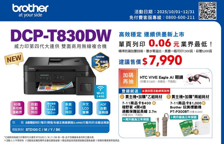 Brother DCP-T830DW 第四代威力印商用連續供墨雙面網路複合機(相片印表機/滿版/噴墨/列印/複印/掃描/WiFi/自動送稿ADF)