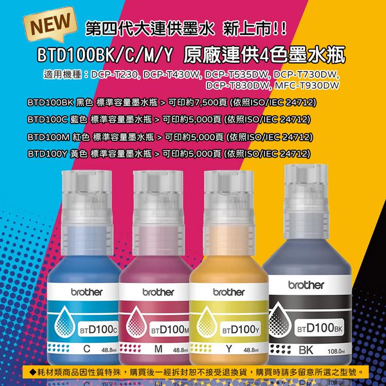 - ※BTD100墨水適用於第四代新連供系列,敬請留意