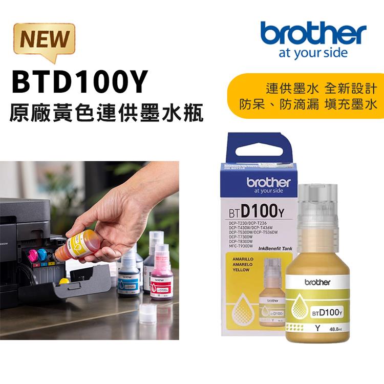 Brother BTD100Y 原廠黃色墨水(適:T230/T430W/T530DW/T535DW/T730DW/T830DW/T930DW)