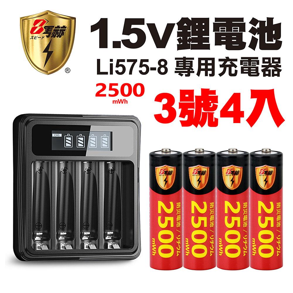 【8馬赫】3號/AA 恆壓可充式1.5V鋰電池全新特大能量2500mWh4入+(3號/4號通用)液晶鋰充電器