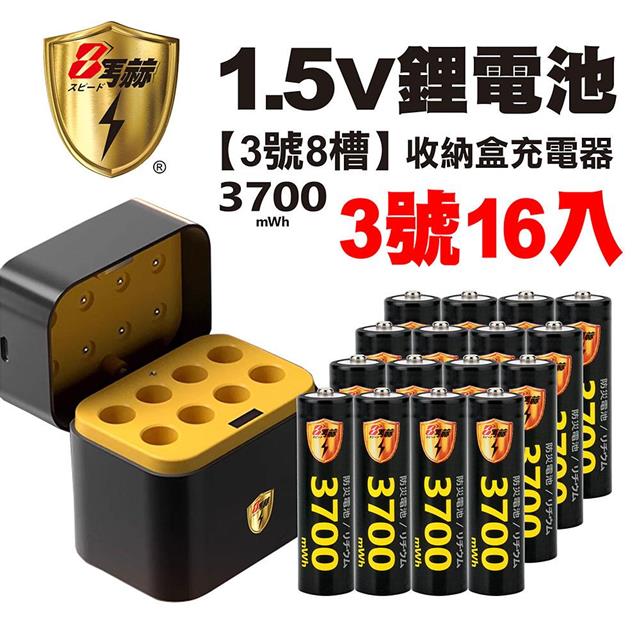 【8馬赫】3號/AA 恆壓可充式1.5V鋰電池全新特大能量3700mWh16入+(3號8槽)AI隨身收納盒充電器