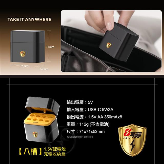 8馬赫鋰電池適合使用大電流要求的電器產品,恆壓電池電量用完前電力並不會減弱。可充達1500次並無記憶效應,也不會漏液並不含鉛汞的環保安全電池可安心使用。