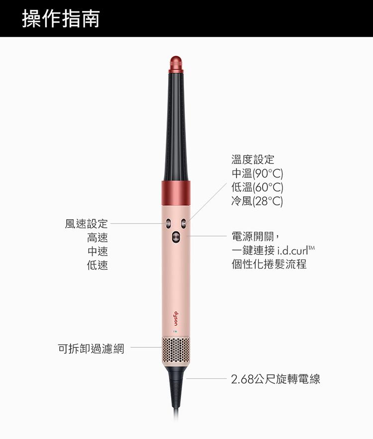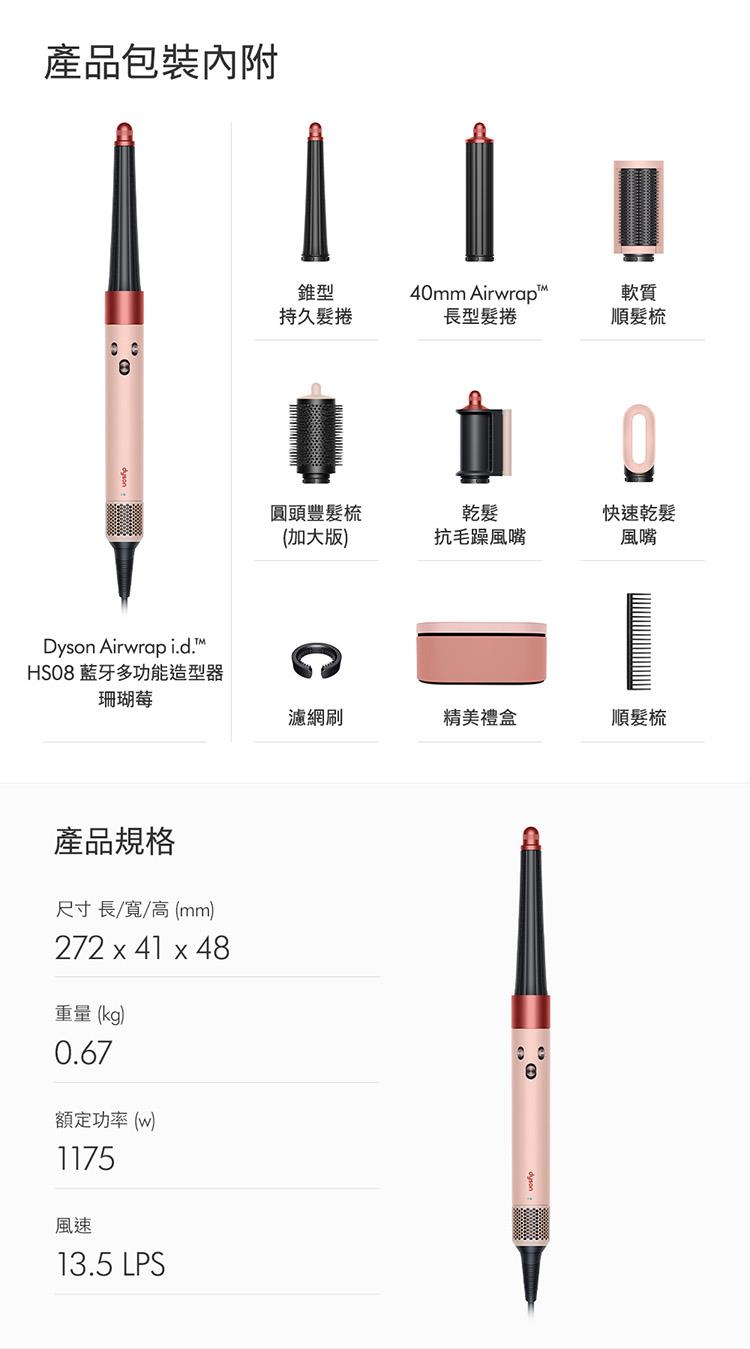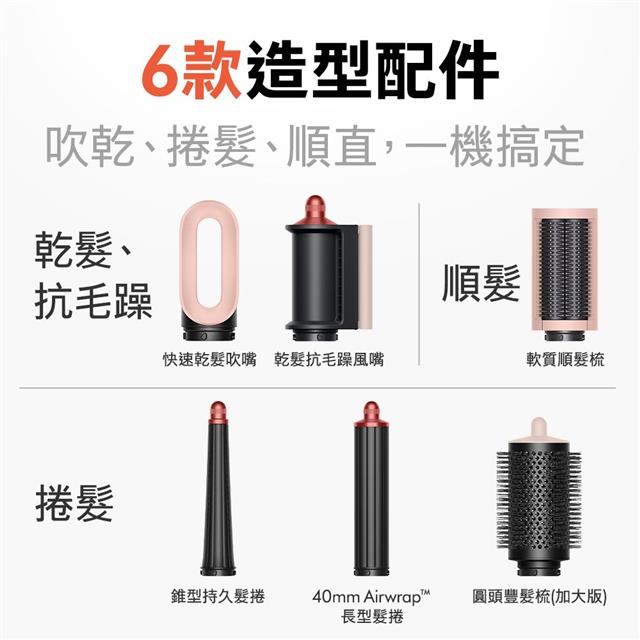 配件:快速乾髮吹嘴Fast dryer、圓頭豐髮梳(加大版)、乾髮抗毛躁風嘴、軟質順髮梳、錐形持久髮捲、40mm AirwrapTM長型髮捲、禮盒(收納盒新設計支援使用手機支架)。