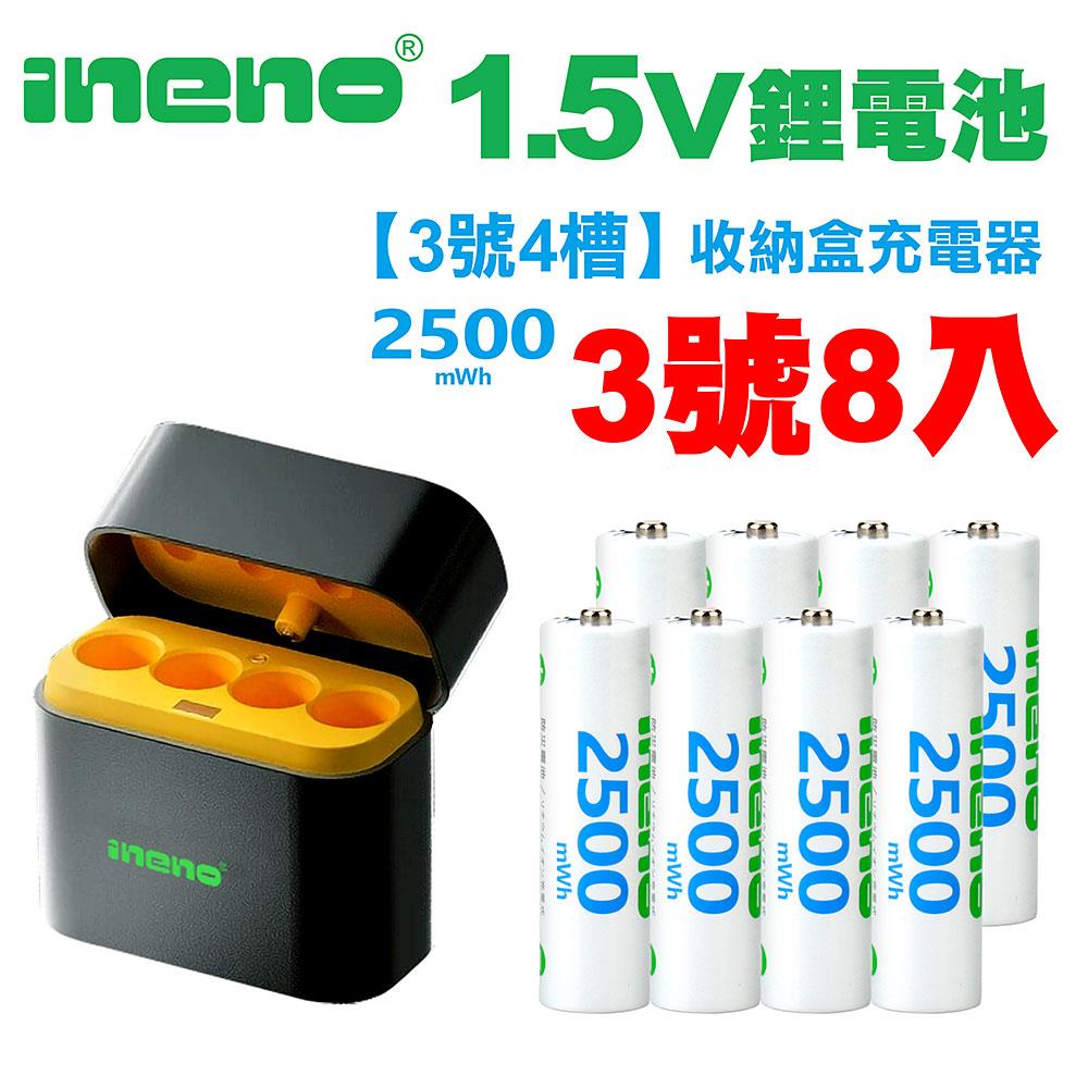 【ineno】3號/AA 恆壓可充式1.5V鋰電池全新特大能量2500mWh8入+(3號4槽)AI隨身收納盒充電器