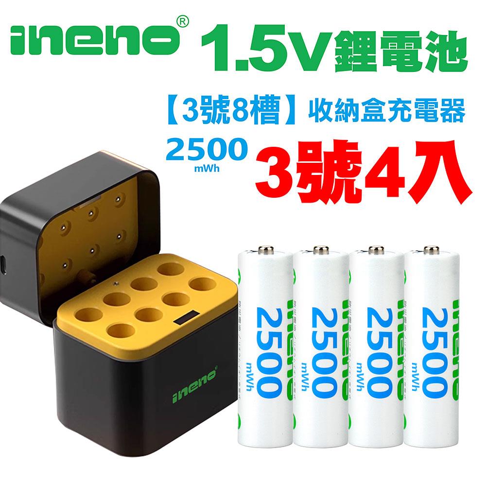 【ineno】3號/AA 恆壓可充式1.5V鋰電池全新特大能量2500mWh4入+(3號8槽)AI隨身收納盒充電器