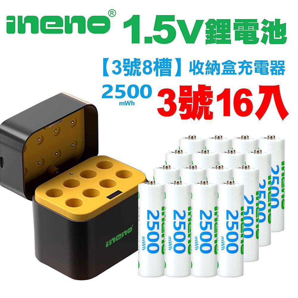【ineno】3號/AA 恆壓可充式1.5V鋰電池全新特大能量2500mWh16入+(3號8槽)AI隨身收納盒充電器