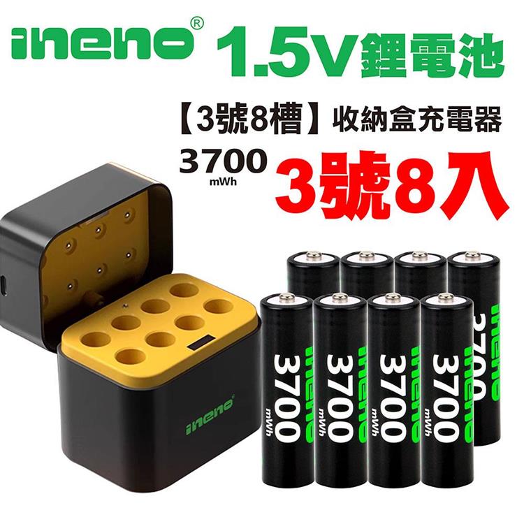 【ineno】3號/AA 恆壓可充式1.5V鋰電池全新特大能量3700mWh8入+(3號8槽)AI隨身收納盒充電器