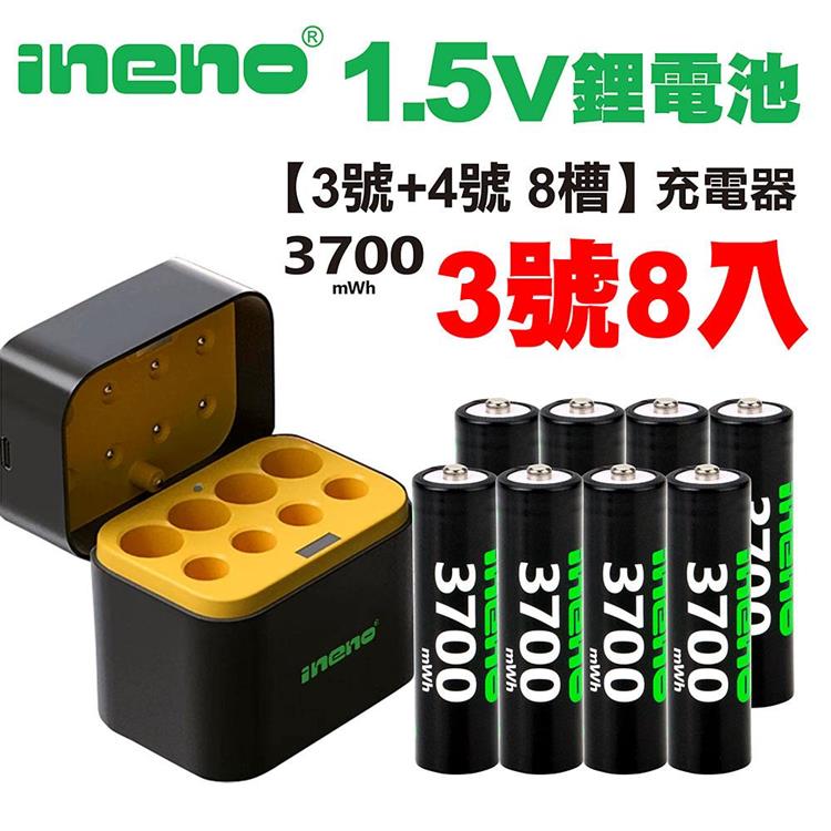 【ineno】3號/AA 恆壓可充式1.5V鋰電池全新特大能量3700mWh8入+(3號/4號各4槽)AI隨身收納盒充電器