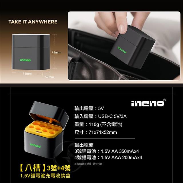 【ineno】3號/AA 恆壓可充式1.5V鋰電池全新特大能量3700mWh16入+(3號/4號各4槽)AI隨身收納盒充電器