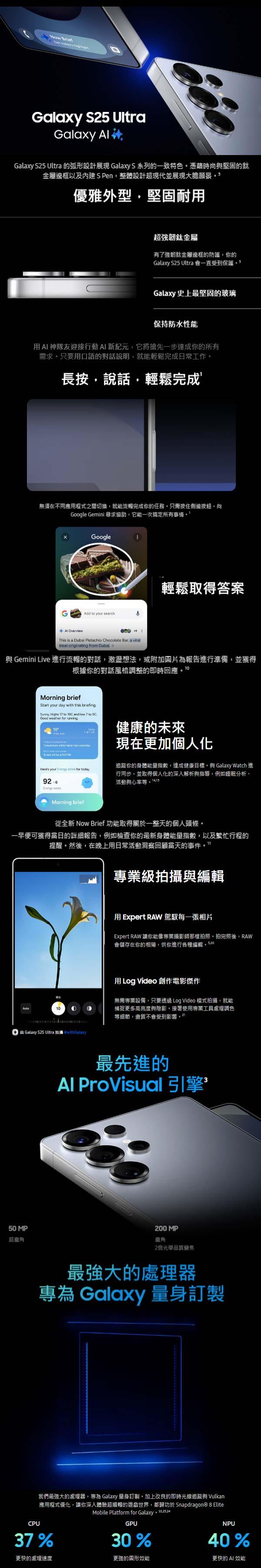 ◎處理器:內建Qualcomm Snapdragon 8 Elite for Galaxy旗艦行動平台