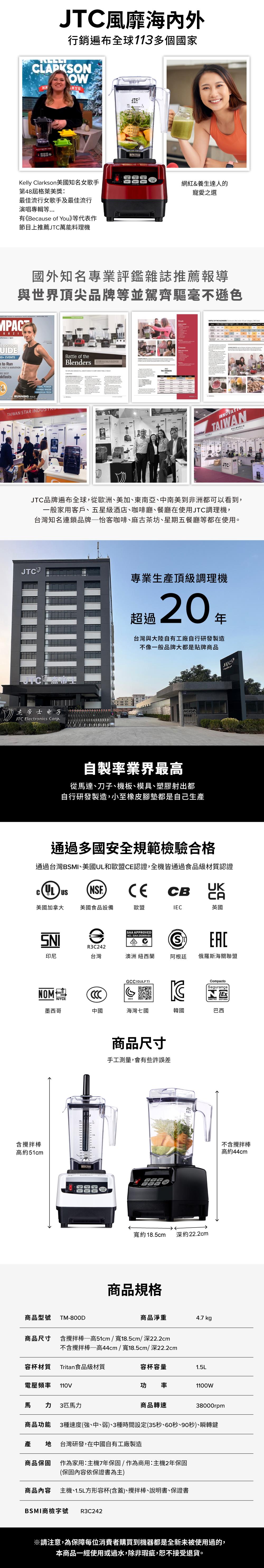 JTC杰帝士 OmniBlend三匹馬力智能萬用調理機1.5L時尚方杯 TM-800D-三色-台灣公司貨(真正破壁機/高敏敏推薦)