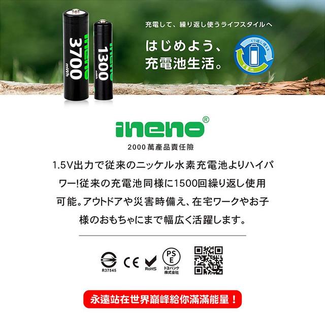 ineno鋰電池適合使用大電流要求的電器產品,恆壓電池電量用完前電力並不會減弱。可充達1500次並無記憶效應,也不會漏液並不含鉛汞的環保安全電池可安心使用。