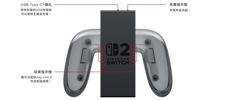 與「Nintendo Switch 2」主機組合隨附的「Joy-Con 2握把」不同,使用附屬的USB充電線或「Nintendo Switch 2 電源供應器」,
