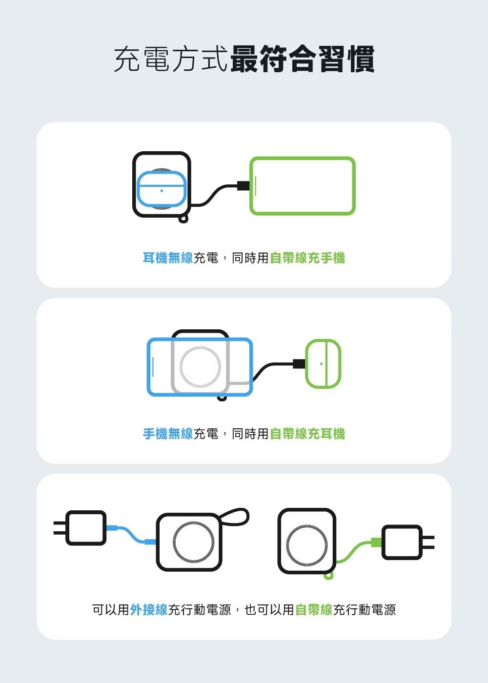 產品內建「Type-C充電線」及「Lightning充電線」,無需額外攜帶線材,即可輕鬆為「蘋果手機」和「Android手機」充電。