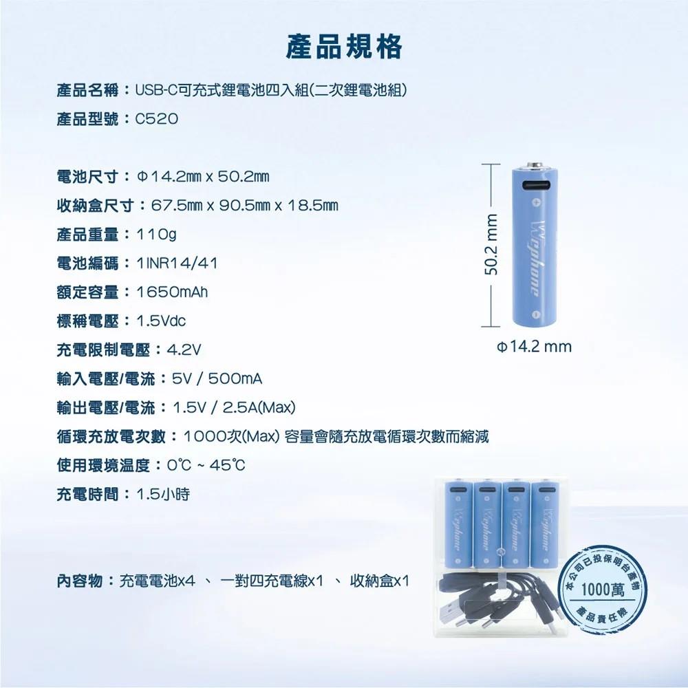 Wephone 3號AA 1.5V USB充電式電池 2475mWh 充電鋰電池(附一對四充電線)