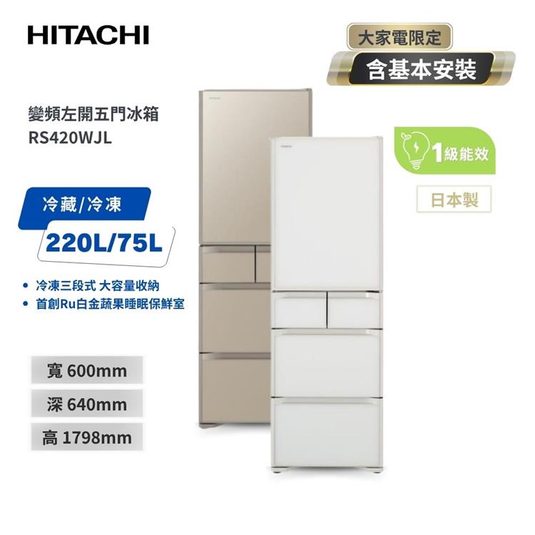 【HITACHI 日立】407L 一級能效日本製變頻質感美型五門左開冰箱 RS420WJL 琉璃白/琉璃金