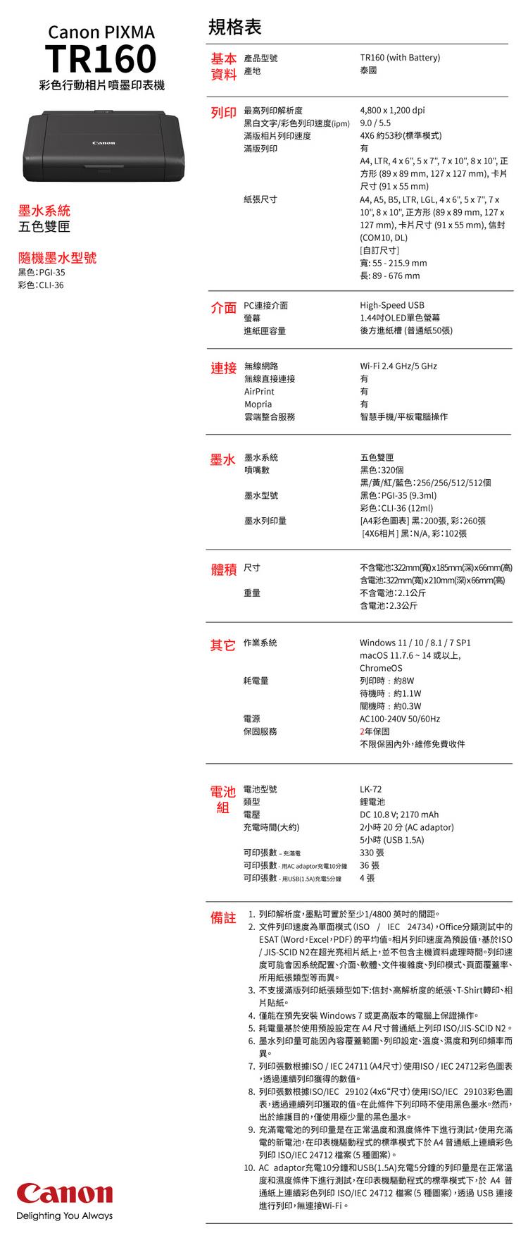 Canon PIXMA TR160 彩色行動相片噴墨印表機+PGI-35+CLI-36墨水組