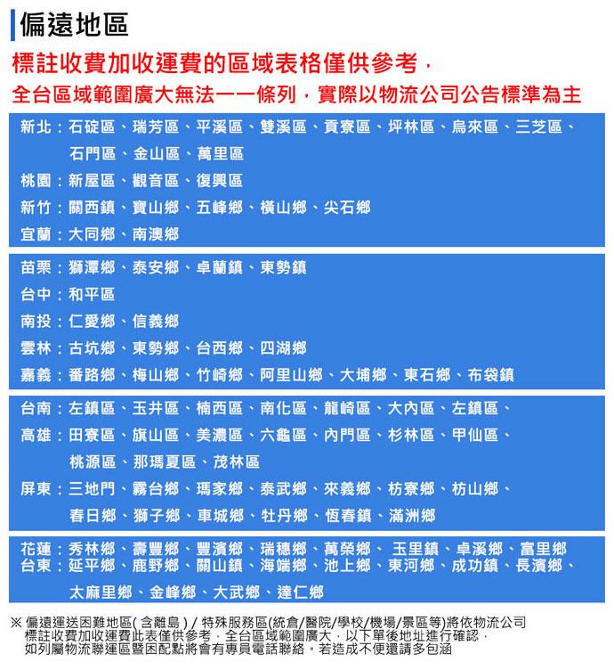 ■部份地區,偏遠/特殊地區無法配送或需加收額外運費,訂購後會有專人與您連繫額外費用的繳納