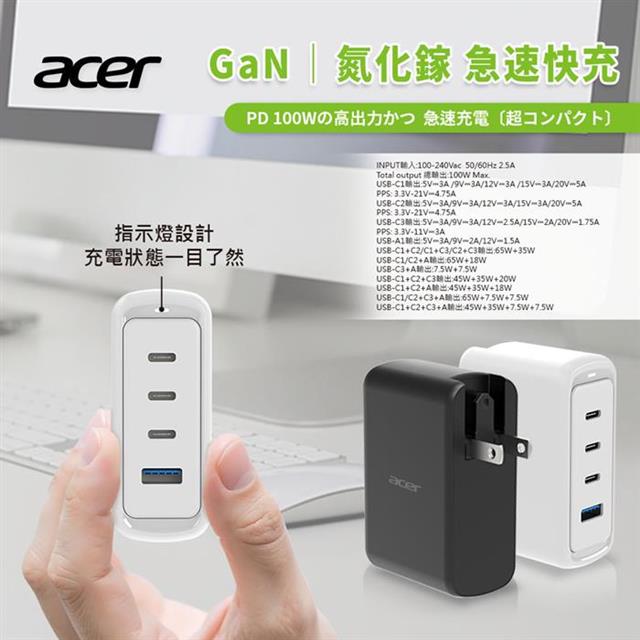 【Acer宏碁】100W 氮化鎵GaN USB-C 四孔(3C1A)電源供應器/充電頭(內附Type-C to Type-C充電線)