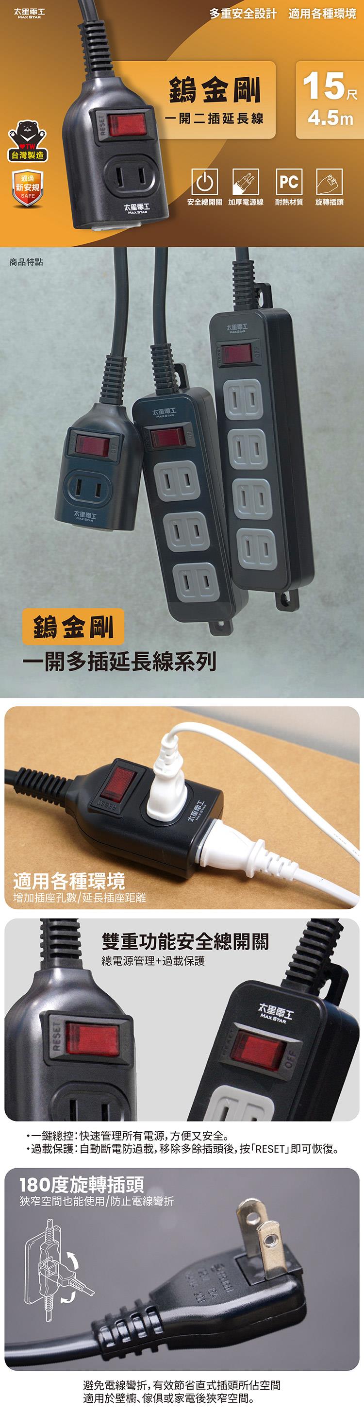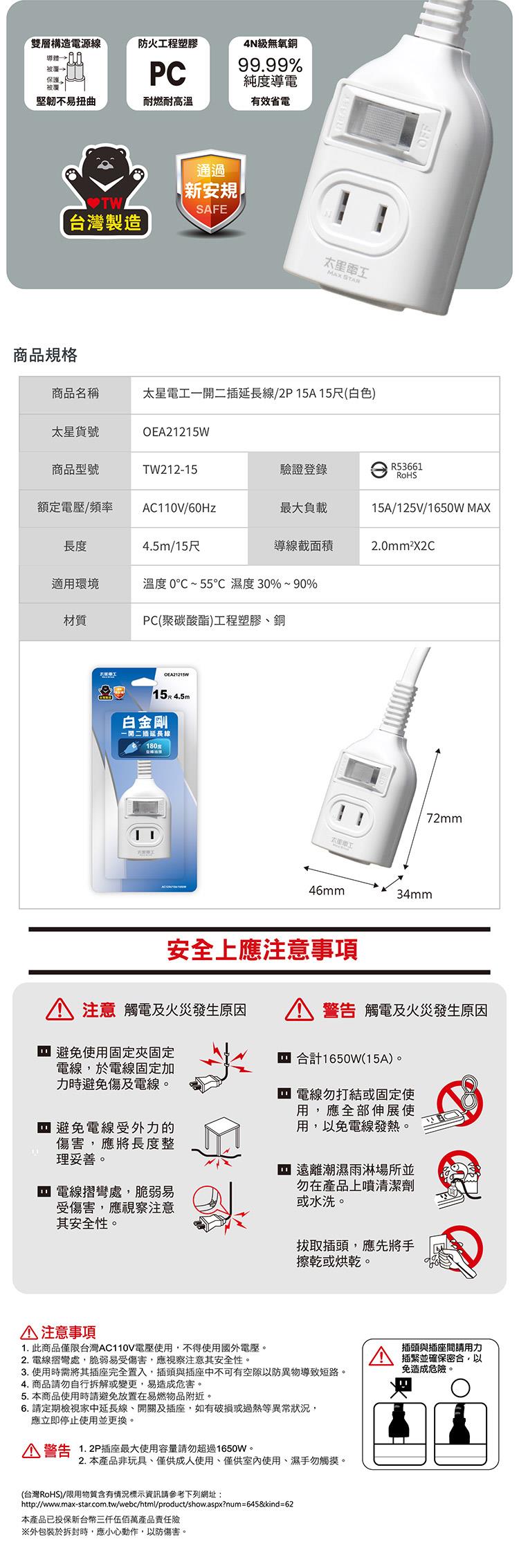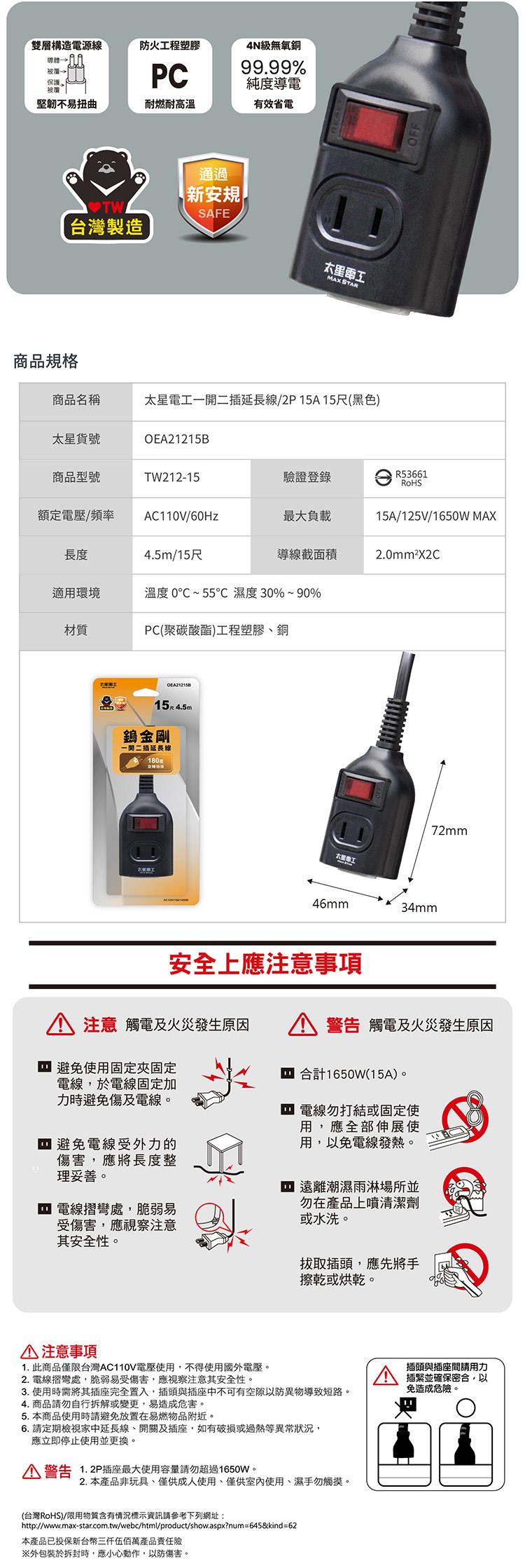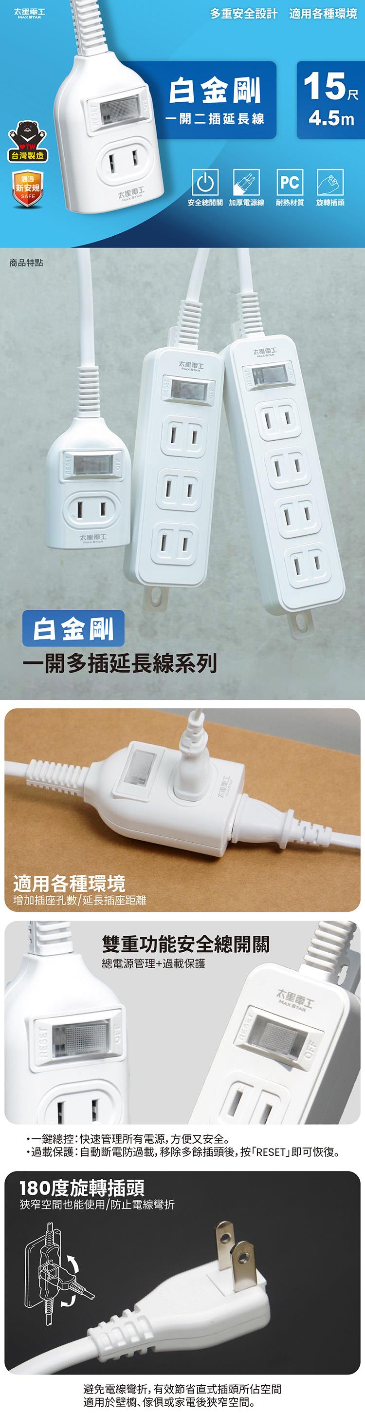 【太星電工】一開二插延長線/2P 15A 15尺 總開關 過載保護 OEA21215
