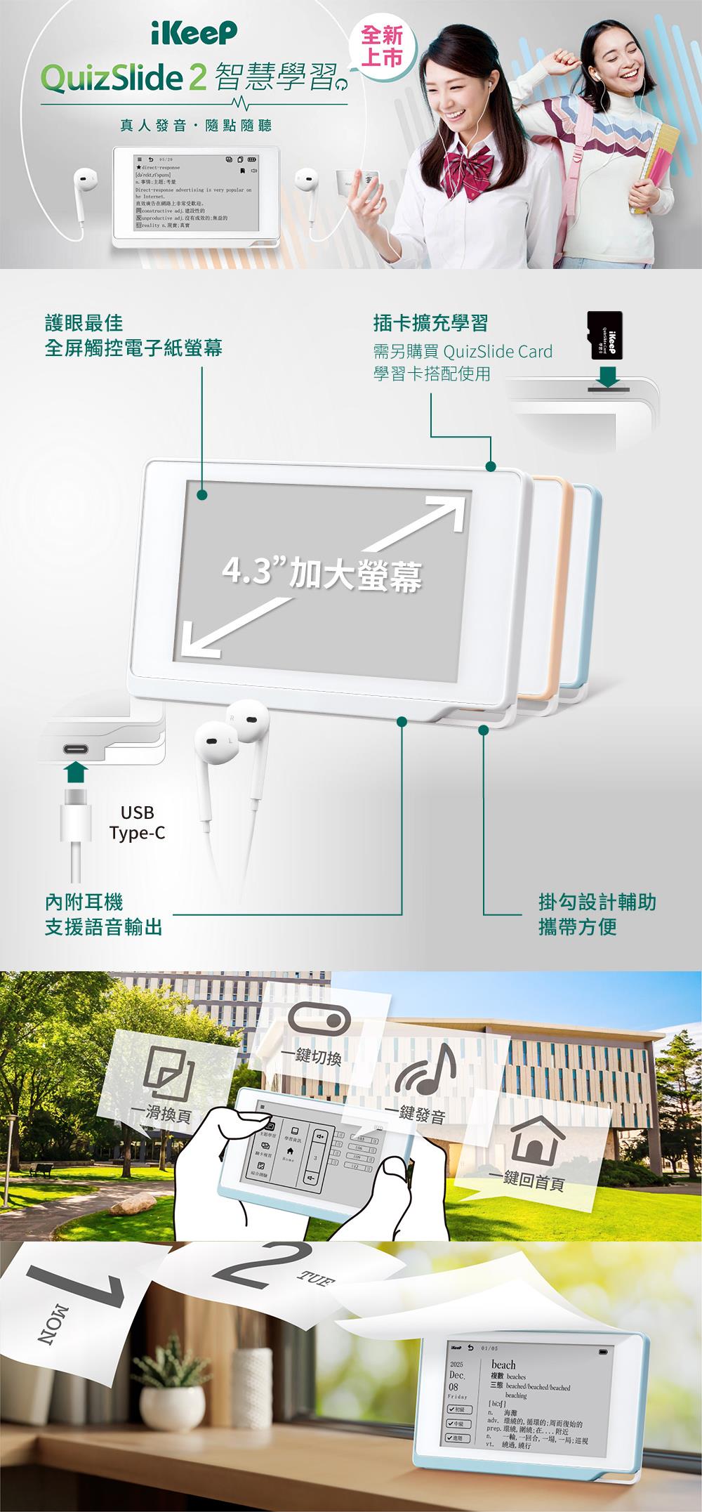 iKeeP重磅推出全新二代QuizSlide 2 智慧學習機,以一代的功能為基礎,賦予全新的設計,更高規的功能與視覺風貌,豐富您的掌心學習世界!