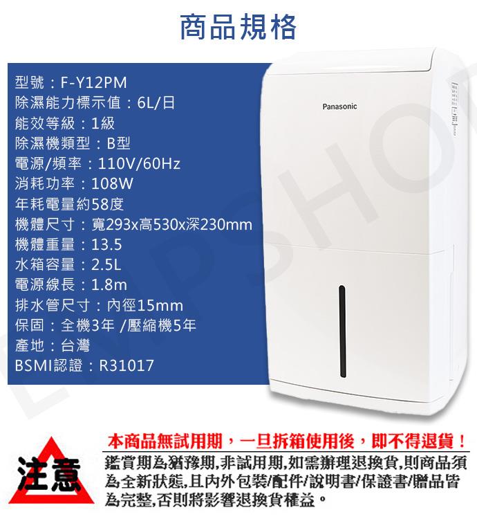【國際牌Panasonic】6公升除濕機 F-Y12PM