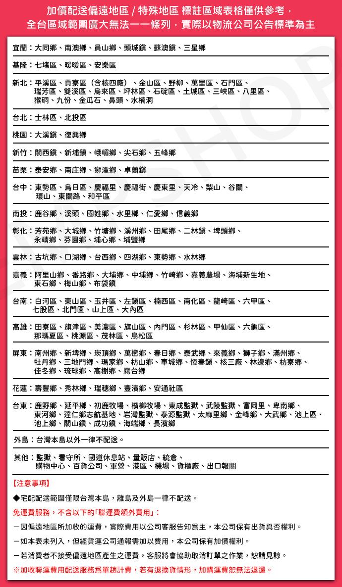 ■部份地區,偏遠/特殊地區無法配送或需加收額外運費,訂購後會有專人與您連繫額外費用的繳納
