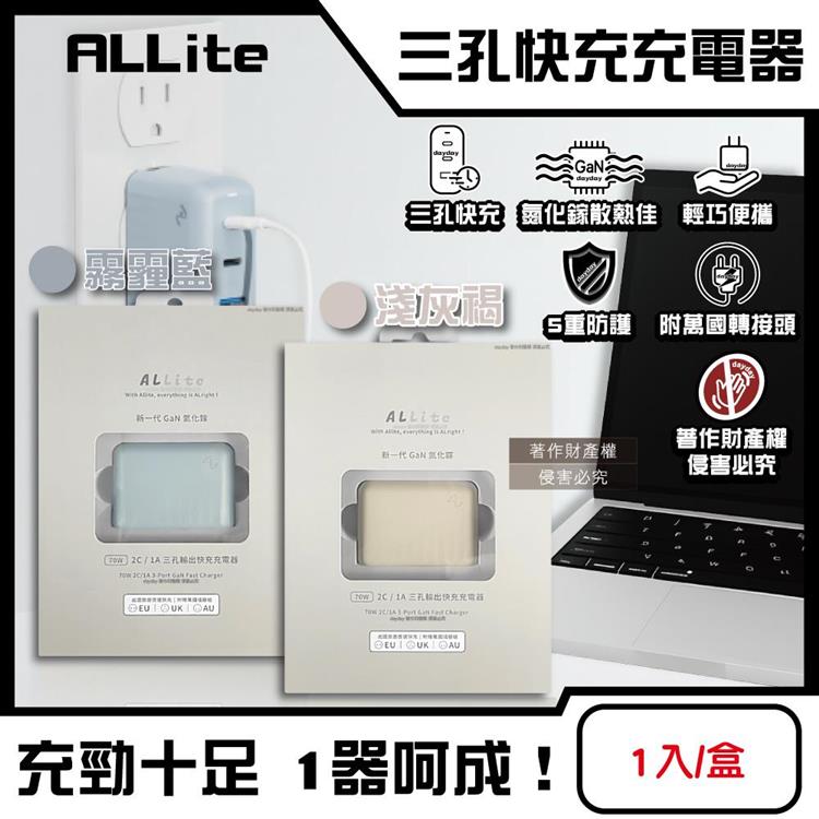 ALLite-A1 PRO 70W 1A+2CG氮化鎵三孔快充充電器1入/盒(原廠保固,附萬國轉接頭/BSMI認證電源供應器/出國便攜旅充頭/支援PD/QC/PPS豆腐頭)