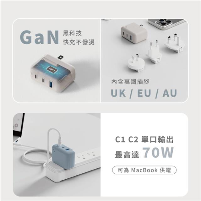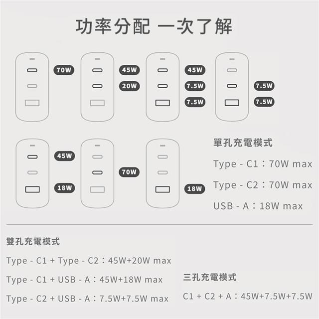 ●品名:A1 PRO 70W 1A+2C氮化鎵三孔快充充電器