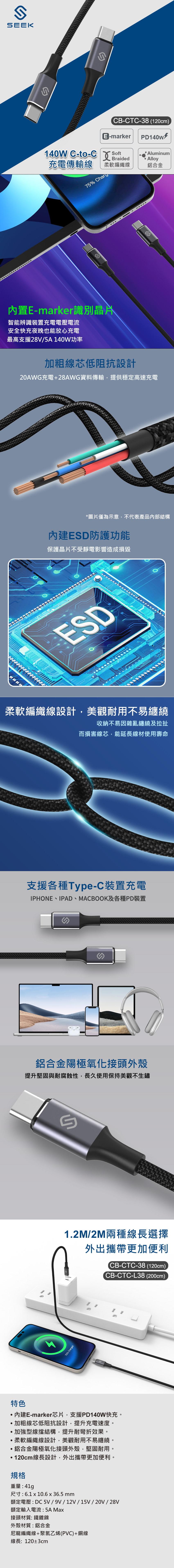 SEEK 140W C-to-C充電傳輸線120cm(CB-CTC-38)