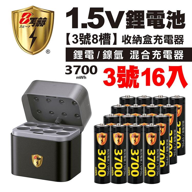【8馬赫】3號/AA 恆壓可充式1.5V鋰電池全新特大能量3700mWh16入+(3號8槽)(鎳氫/鋰電 混充型)AI隨身收納盒充電器