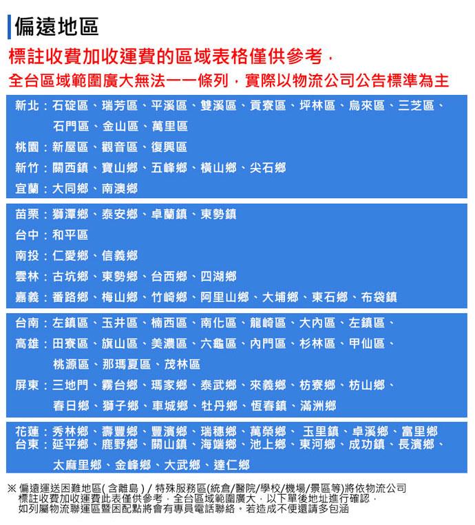 ■部份地區,偏遠/特殊地區無法配送或需加收額外運費,訂購後會有專人與您連繫額外費用的繳納