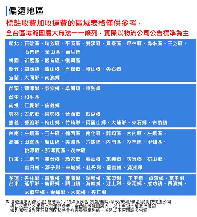 ■部份地區,偏遠/特殊地區無法配送或需加收額外運費,訂購後會有專人與您連繫額外費用的繳納