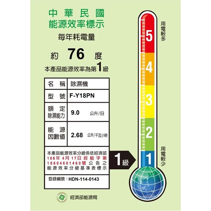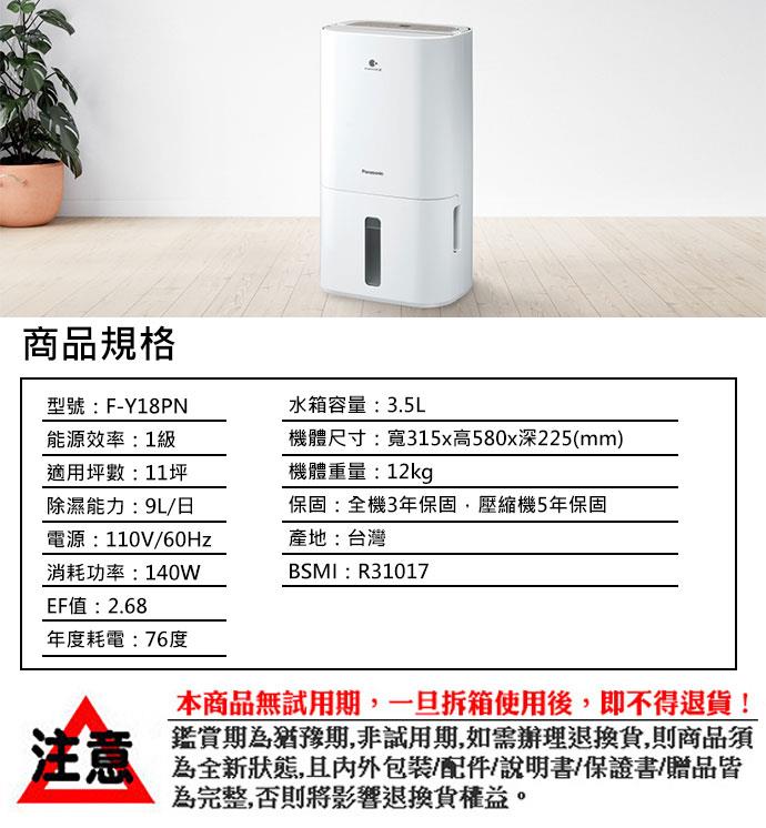 【國際牌Panasonic】9公升清淨除溼機 F-Y18PN