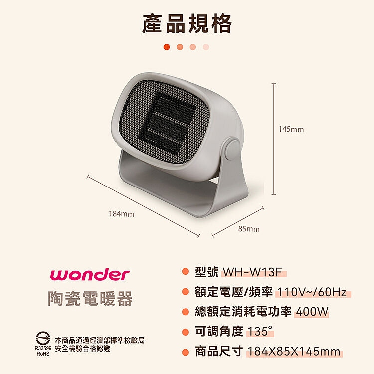 【WONDER 旺德】陶瓷電暖器/暖氣機/電暖爐(WH-W13F)奶白色