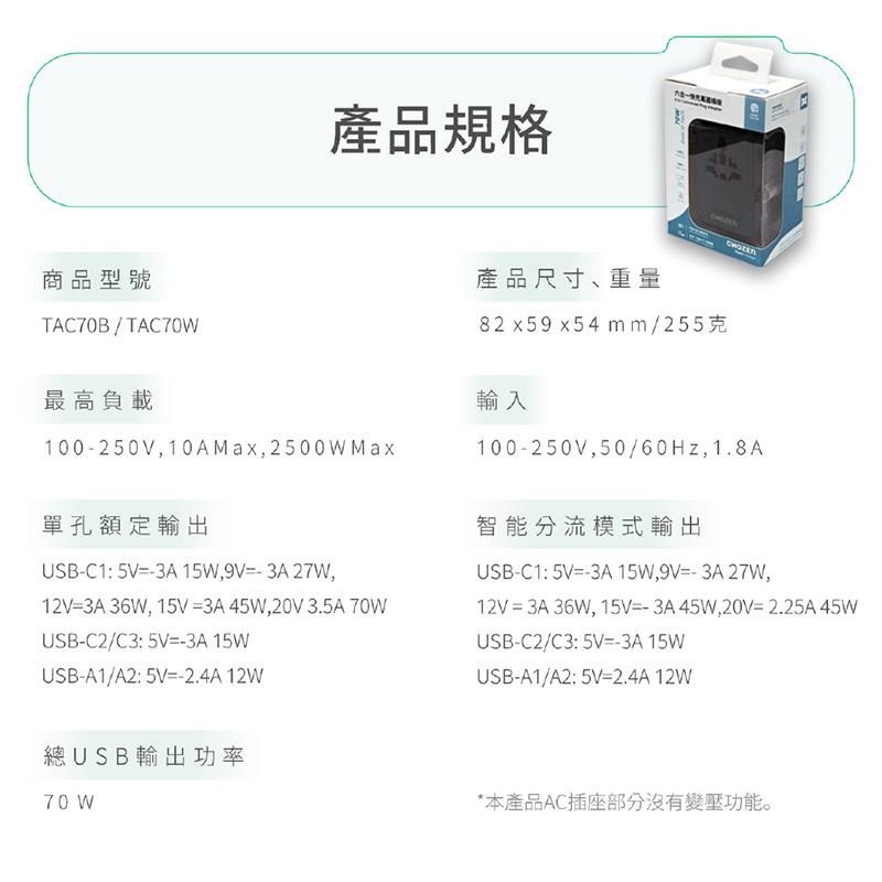 CHOZEN PD70W氮化鎵 六合一快充萬國轉換頭 附線 出國1顆搞定