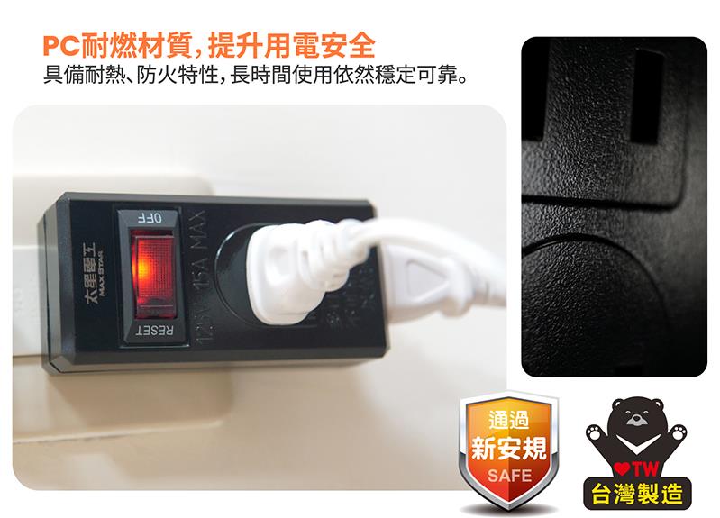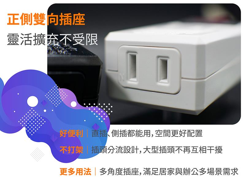 ◆安全開關 過載保護 ◆ PC防火耐燃材質 ◆正側插座 不佔空間 ◆ 台灣製品質有保障 ◆投保新台幣三千伍佰萬產品責任險