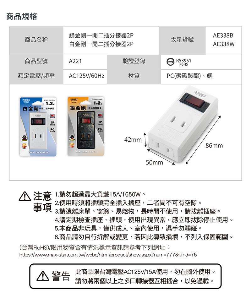 1.此商品限台灣電壓AC125V/15A使用,勿在國外使用。