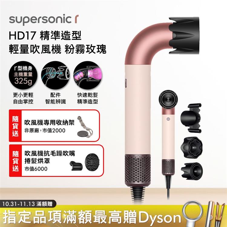 Dyson戴森 HD17 Supersonic r 精準造型 輕量吹風機 粉霧玫瑰【送收納架+抗毛躁吹嘴+烘罩+4ML髮乳*2】