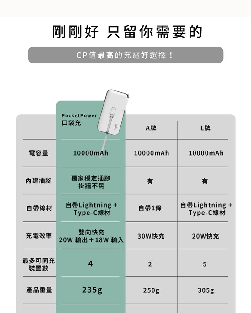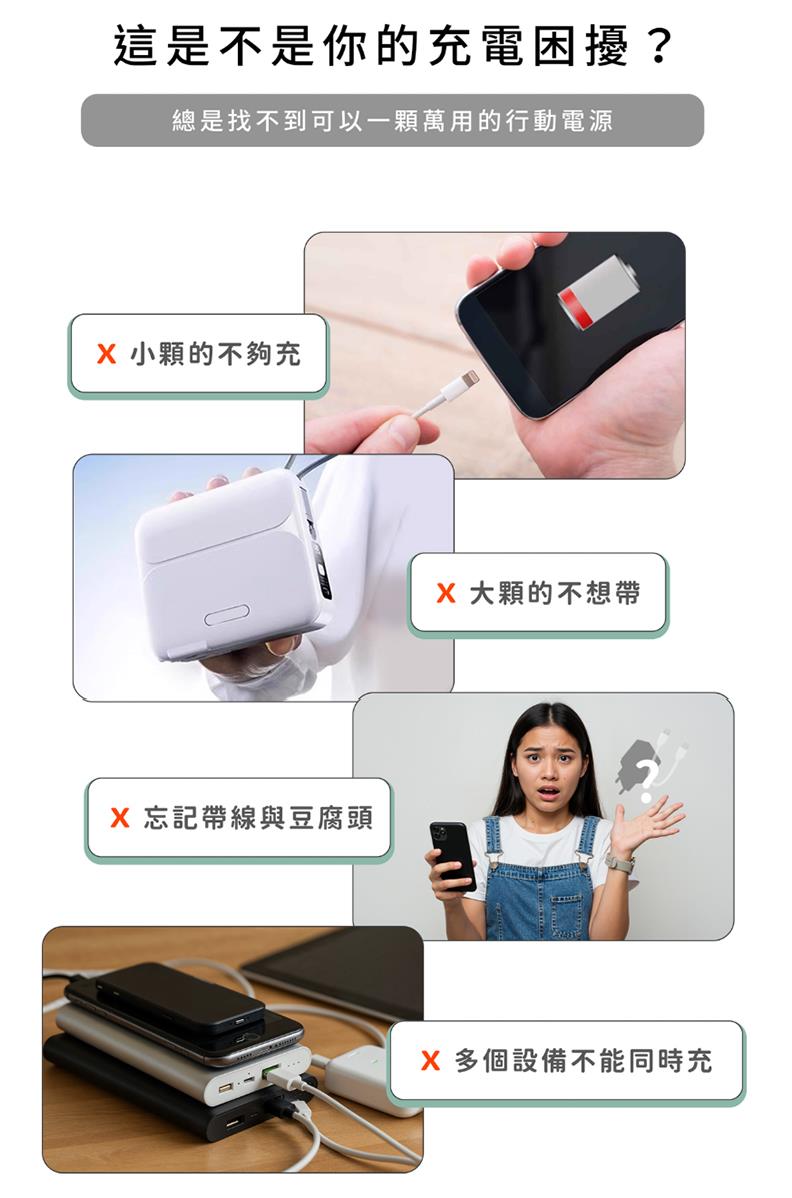 ◆出門免帶線 隨時滿電 ◆雙線內建 快充更便利 ◆BSMI認證 安全有保障 ◆雙向快充 四個設備同時使用 ◆可帶出國使用 上飛機免煩惱