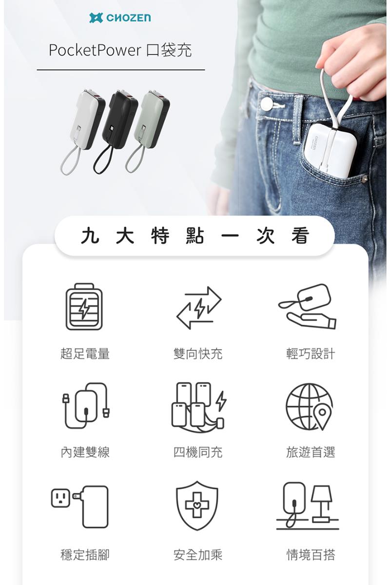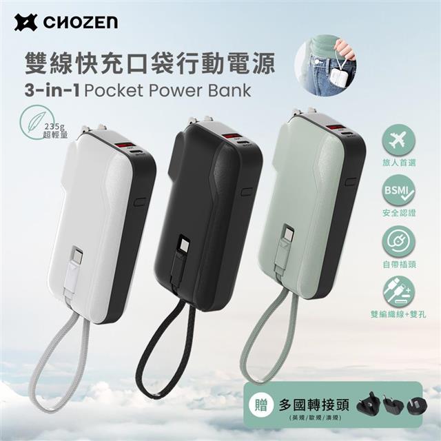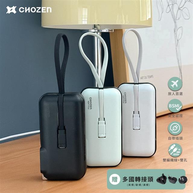 【CHOZEN】 雙線快充口袋行動電源10000mAh (贈轉換插頭) 可登機 大電量 體積小 出國旅行 4台設備同時充