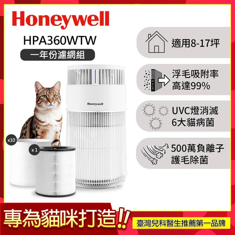 【一年份濾網組】美國Honeywell 貓咪UVC殺菌抗敏空氣清淨機 HPA360WTW (適用8-17坪|喵淨機)