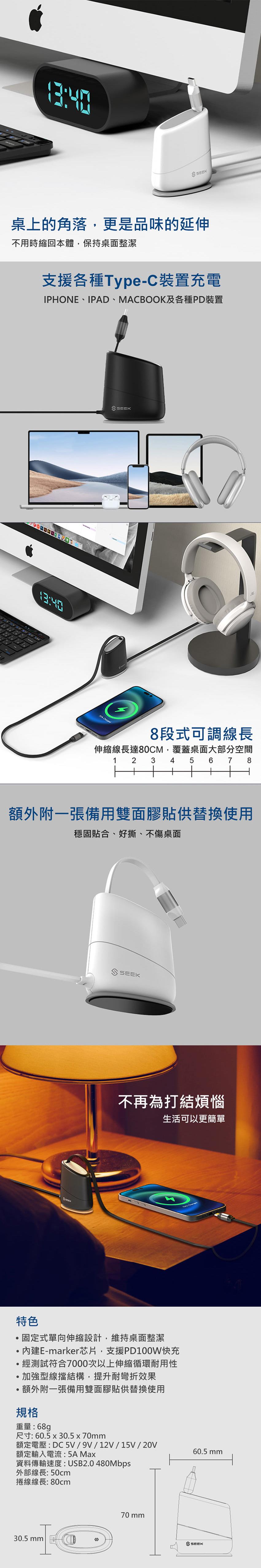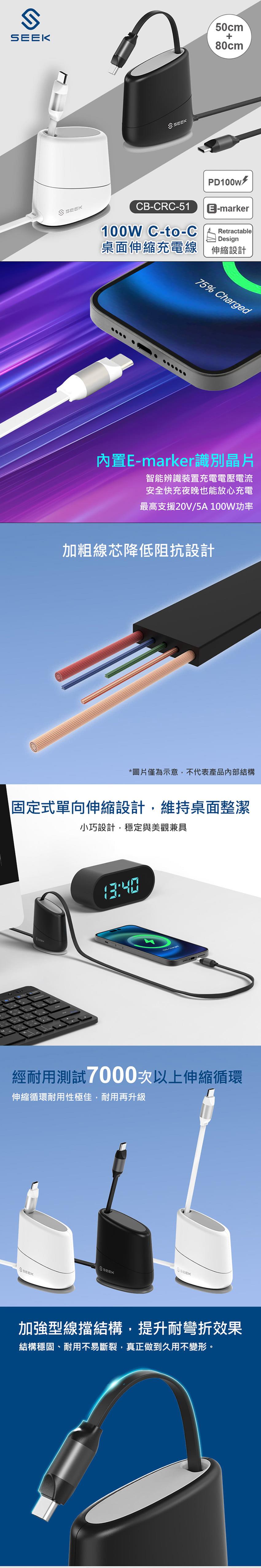 SEEK 100W C-to-C桌面伸縮充電線(CB-CRC-51)