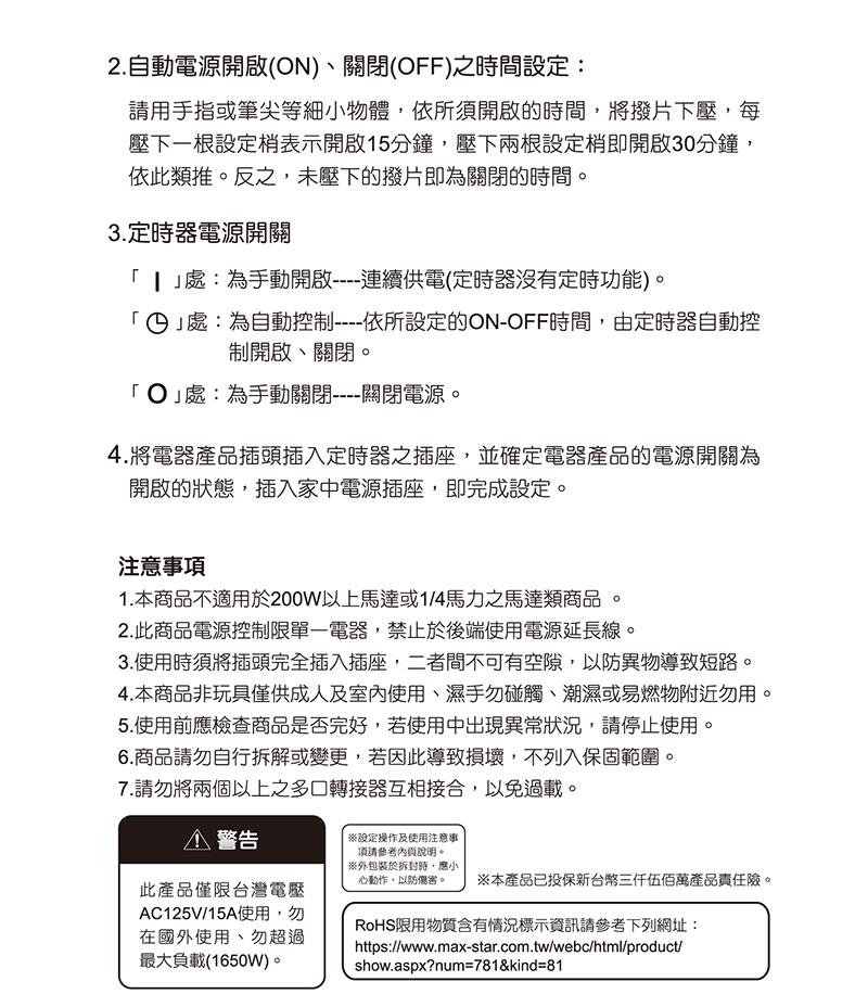 此產品僅限台灣電壓AC125V/15A使用,勿在國外使用、勿超過最大負載(1650W)