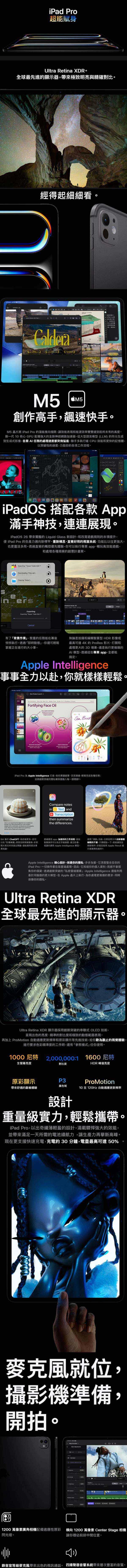 ◎螢幕:11吋Ultra Retina XDR顯示器、串聯式OLED技術、2420 x 1668 pixels解析度、ProMotion技術,支援10Hz至120Hz、自動適應更新頻率、廣色域(P3)、原彩顯示、防指印疏油外膜、全平面貼合、抗反射鍍膜、SDR亮度:1000尼特最大亮度;XDR亮度:1000尼特最大亮度(全螢幕),1600尼特峰值亮度(僅限HDR內容)、1尼特最低亮度、2,000,000:1對比度、支援Apple Pencil Pro、支援Apple Pencil(USB‑C)、Apple Pencil懸浮功能、264 ppi