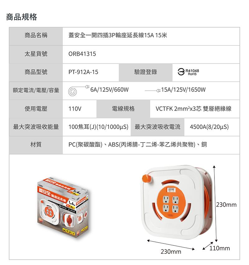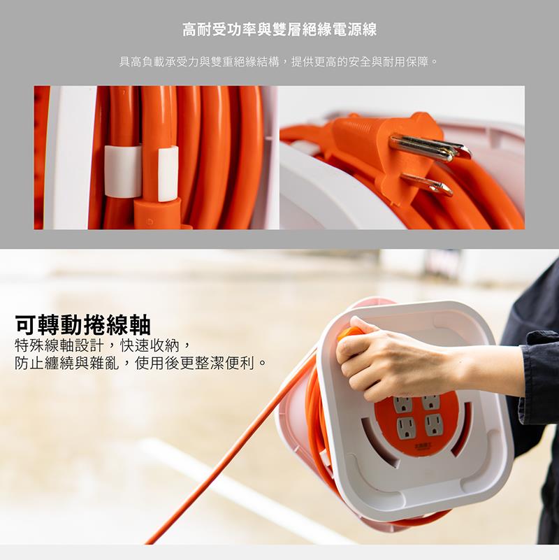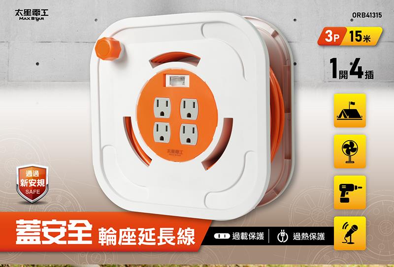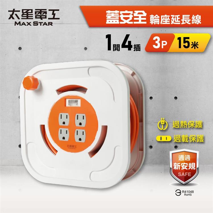 【太星電工】蓋安全一開四插3P輪座延長線15A 15米(1500公分) 總開關 過載保護 過熱保護 ORB41315